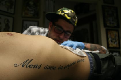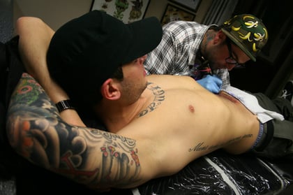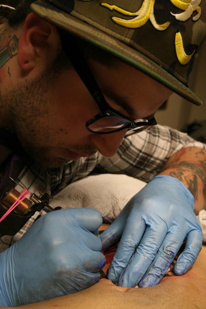 Something more than ink, shows Seb of the band "Breath'n'Stop" receiving a tattoo by band tattoo artist/drummer Kevin. "Breath'n'Stop" was a hardcore band from the Ruhrgebiet, Germany that wanted to perpetuate their ideals via the art of tattoo as well in music. These images were taken before they disbanded at the end of 2008.